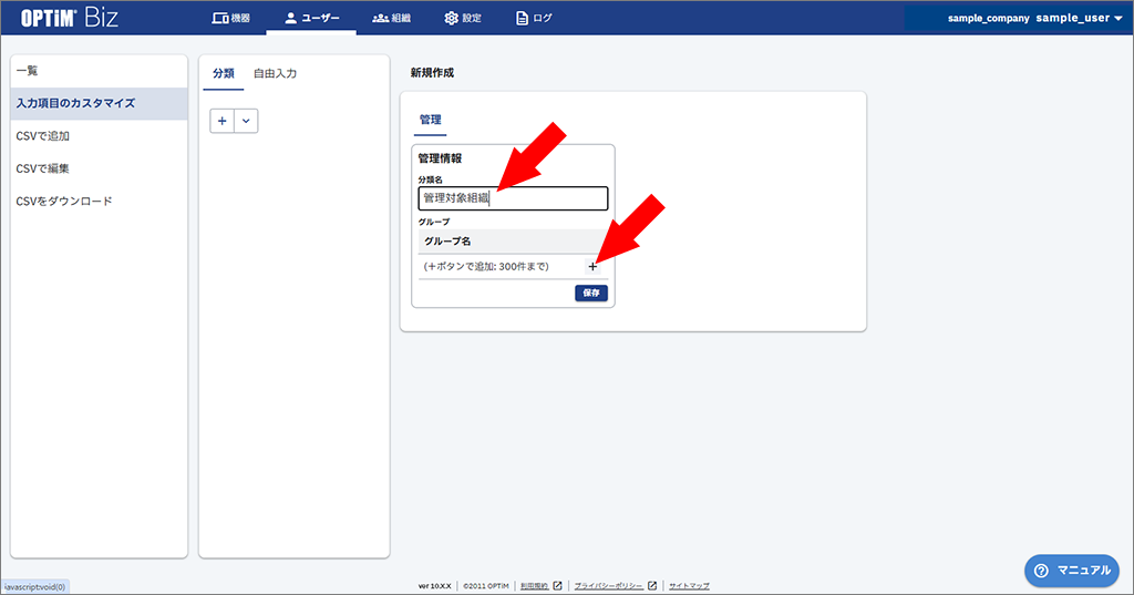 - 「分類名」に「管理対象組織」と入力し、「グループ」の